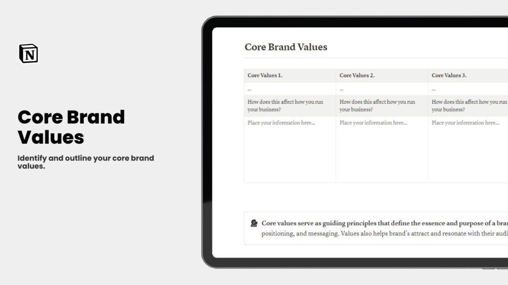 - Core Brand Values: Identify and outline your core brand values.